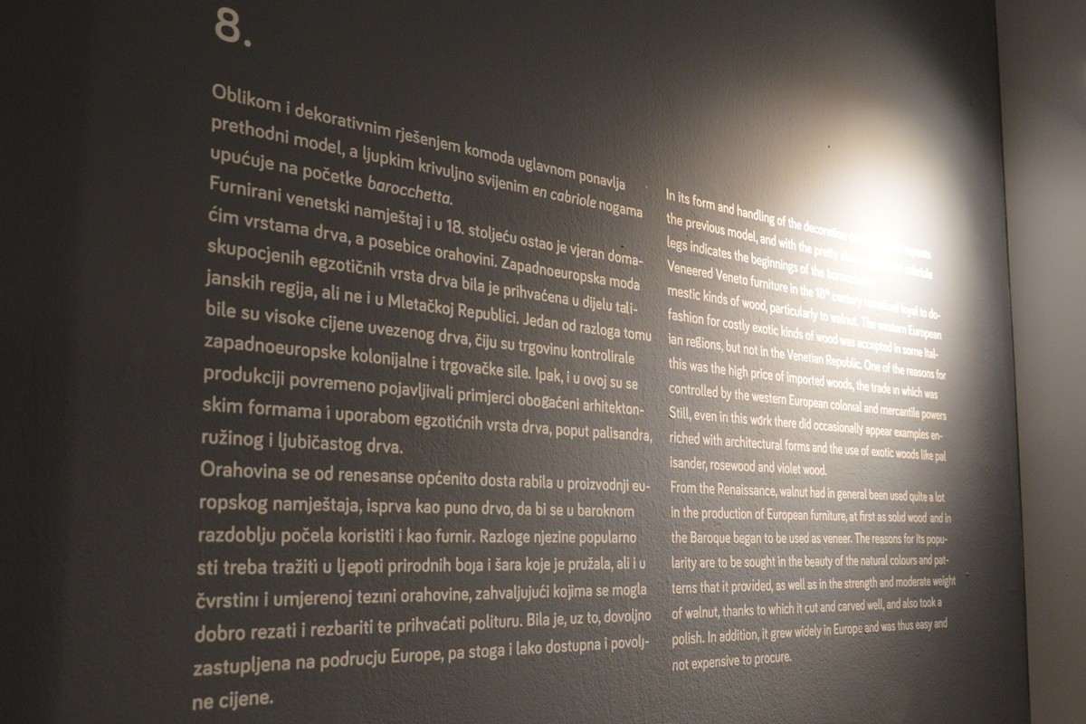 Exhibition represents the development of the dressers through centuries, more precisely from the 17th to the 19th century. The most prominent examples are those from the 18th century when the dressers were a special part of the fashion trends of the time. Ones that can be seen in Dubrovnik Museums are mostly bought by Museums, but some were gifts, especially after WWII – built by Italian masters from Venice, Naples, Genoa and Sicily.