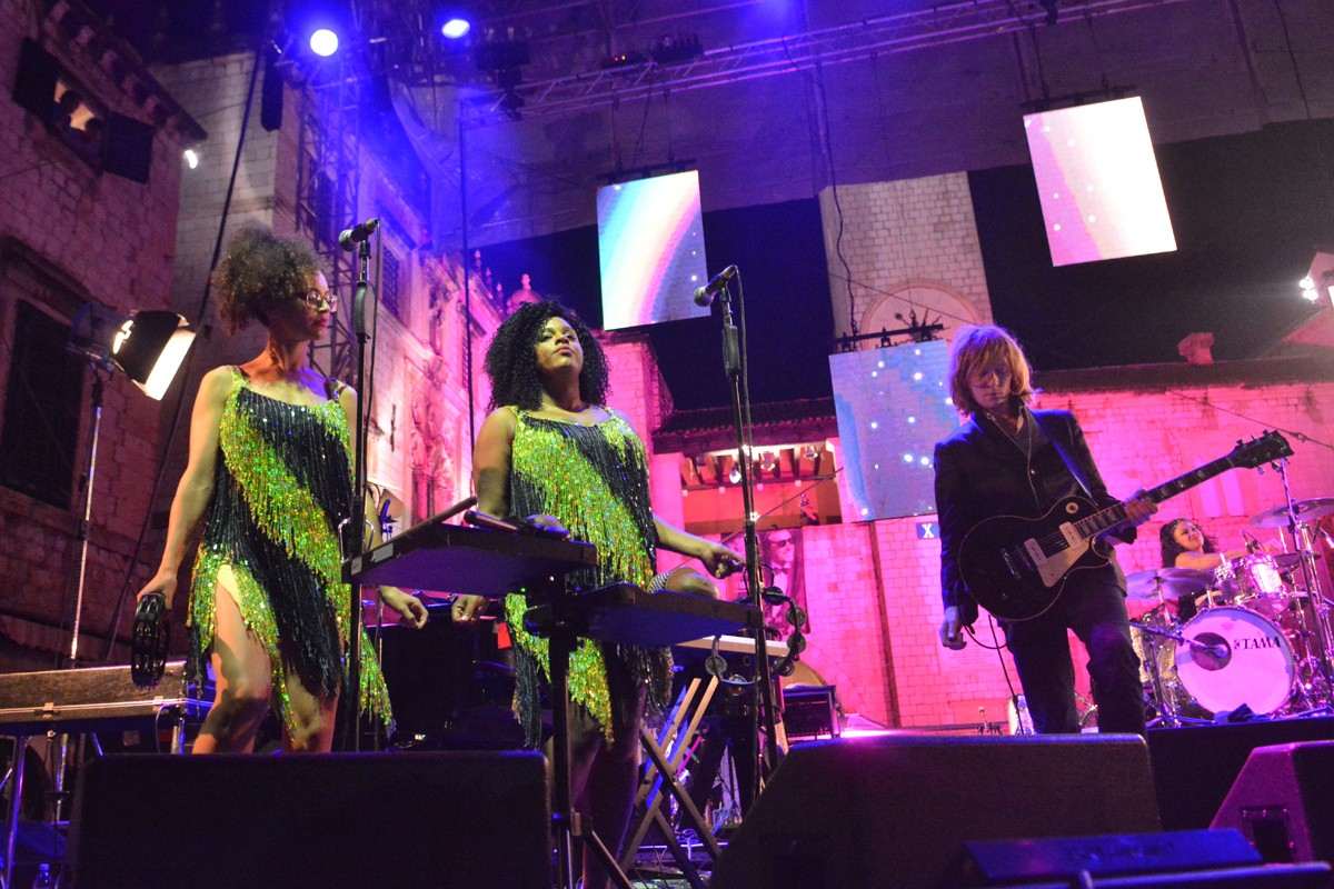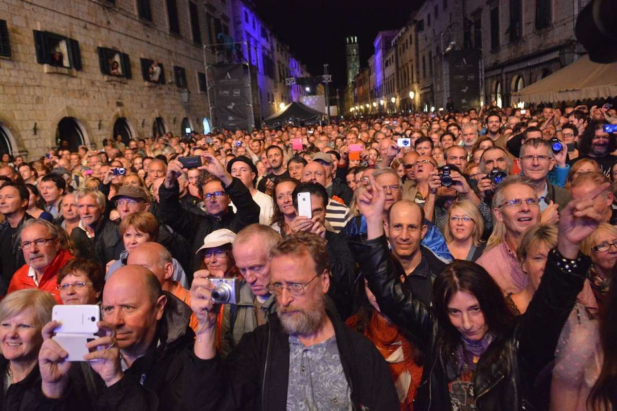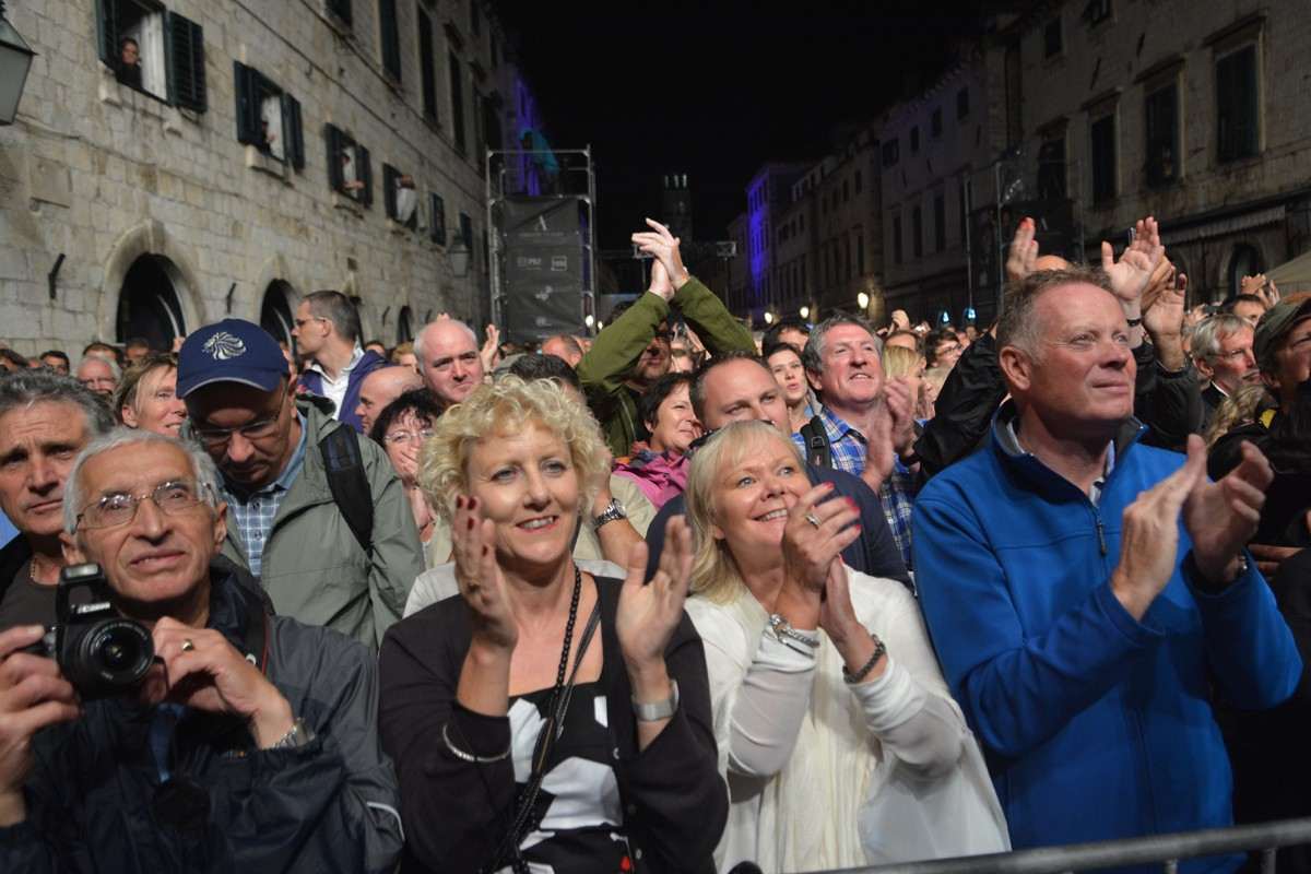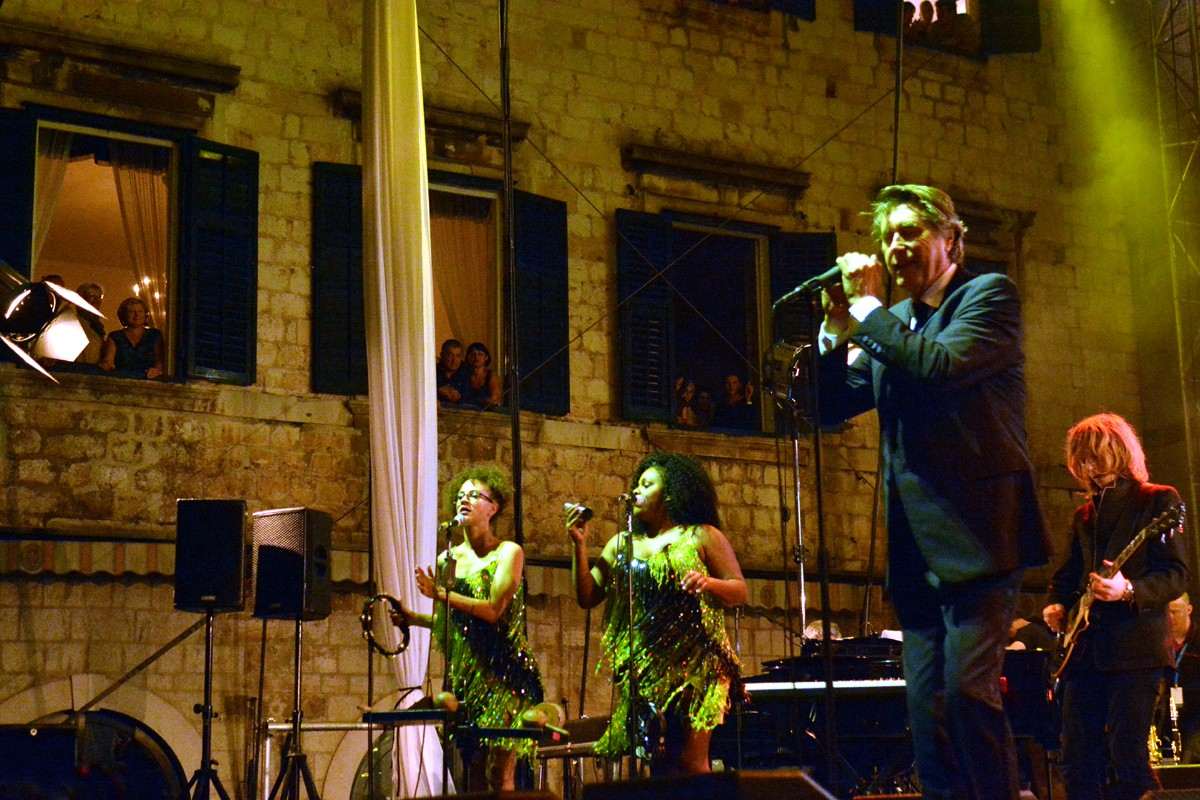 Rain clouds hovered over Dubrovnik all day yesterday, and with intermittent showers it seemed that the chances of the concert going ahead were slim. A huge downpour at around 21 30 threatened to cancel Bryan Ferry’s big night in Dubrovnik but around and hour later the big screens came back on and musicians appeared on stage to tune their instruments. What followed was an incredible performance by Ferry and the Bryan Ferry Orchestra with hundreds packed on the Stradun delighting in the free concert. People came prepared with rain coats, cagoules and umbrellas and others just gave in to the weather and went barefoot. Ferry’s concert was a truly one of a kind experience with his stage framed by the Sponza Palace and the Church of St. Blaise. Event organisers Adriatic Luxury Hotels gifted the concert to the City of Dubrovnik and its guests to mark the Hotel Excelsior’s 100th birthday and what a party it was.