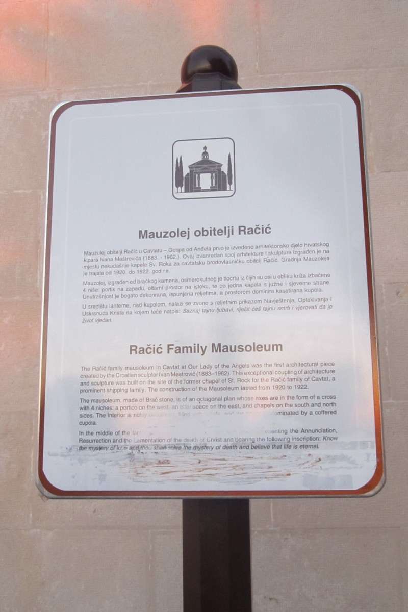 The Racic mausoleum designed by celebrated Croatian sculptor Ivan Mestrovic is the final resting place of the prominent Cavtat shipping family and is located in the graveyard of St. Rocco in Cavtat. The mausoleum itself was erected in 1921, but the Chapel of St. Rocco dates from the 15th century.