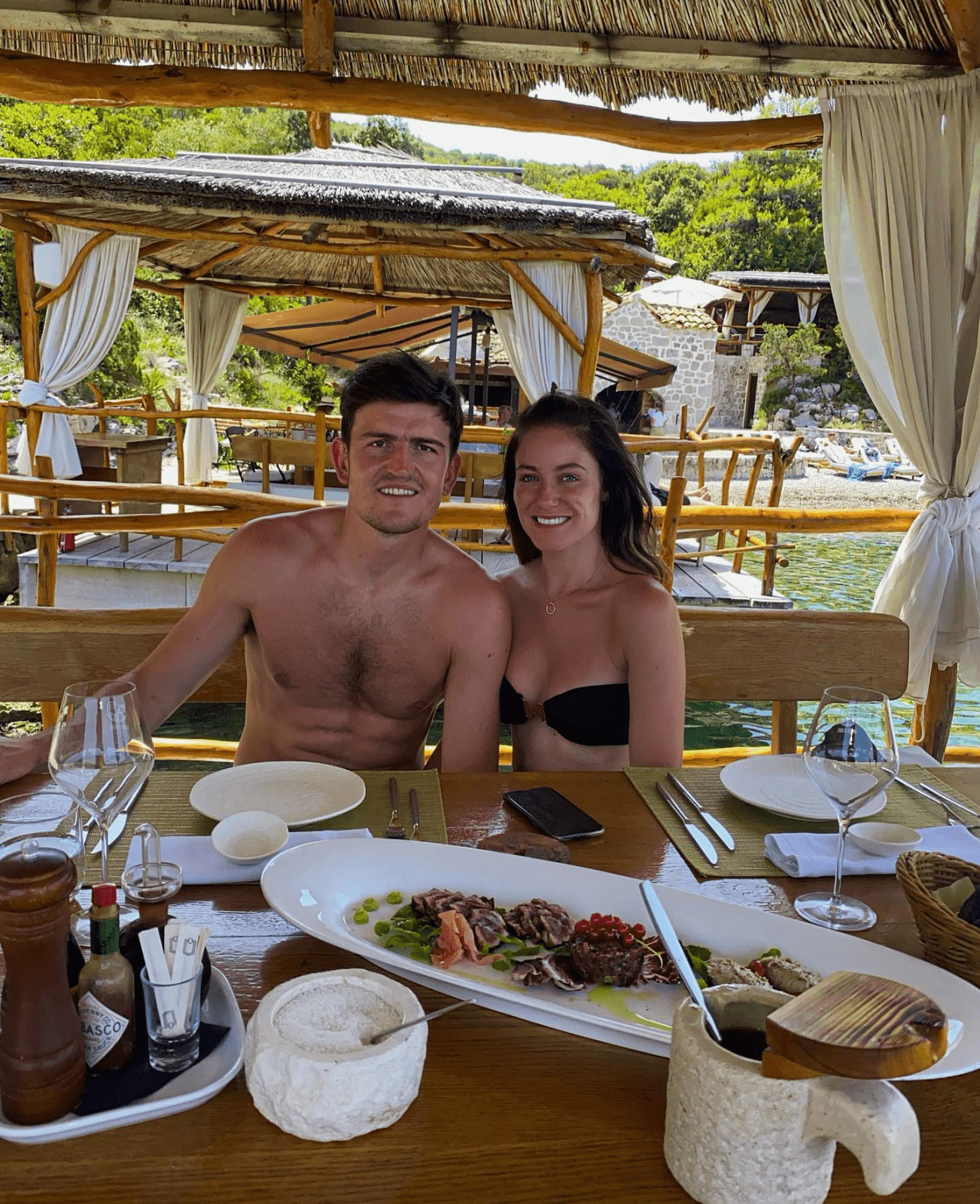 On the photos Maguire is seen enjoying a romantic sea-side meal on Šipan island with his bikini-clad fiancée Fern Hawkins. The most expensive defender in the world, arriving at United from Leicester for 87 million euros, seems to be relaxing on a lavishing yacht, showing of his muscular figure before displayed his diving skills leaping off the yacht and into the crystal waters below. Hawkins also took to her own social media, which boasts a 30k following, sharing further snaps of their sun-soaked Dubrovnik getaway. ‘Evenings in Dubrovnik’, she wrote briefly alongside photos of their time in the Old Town.