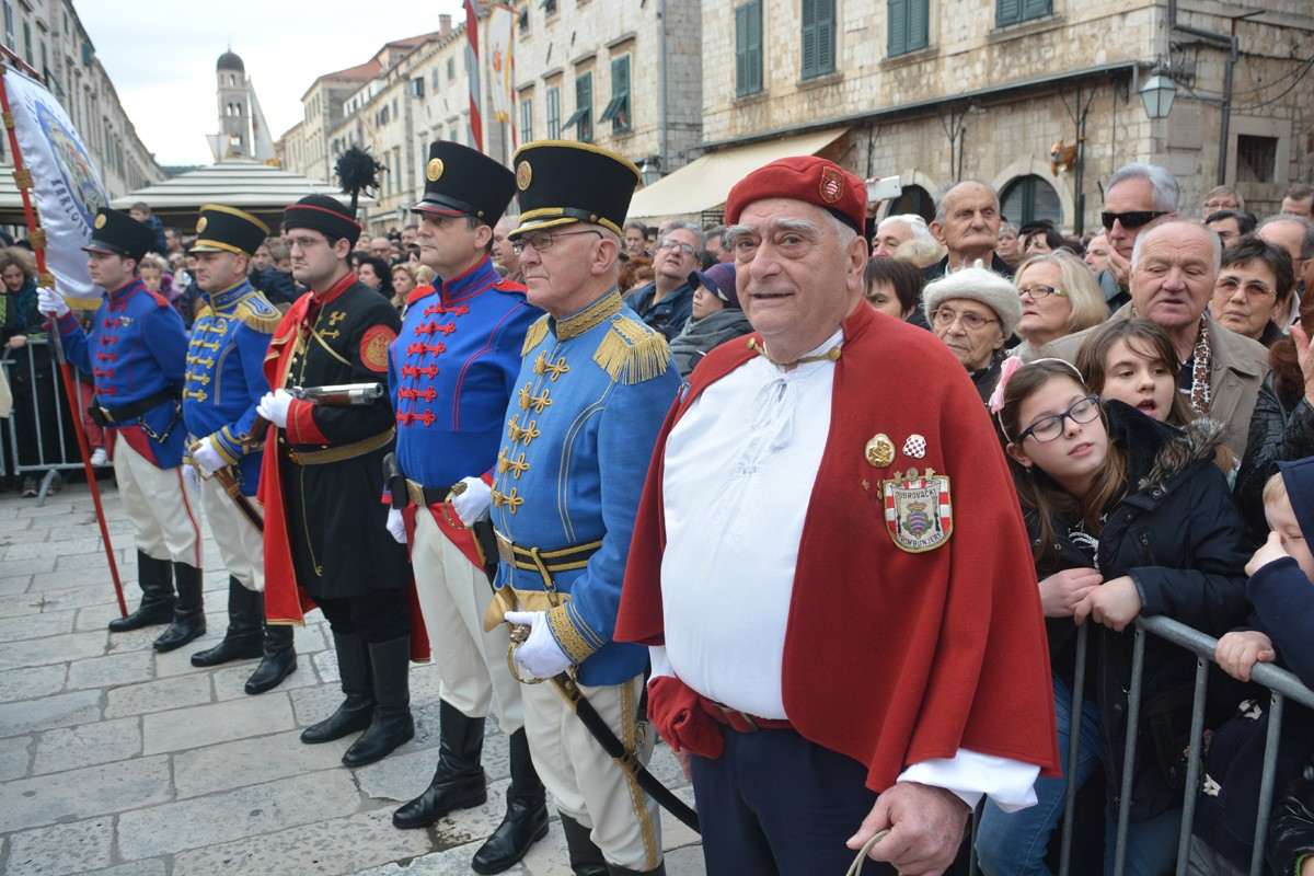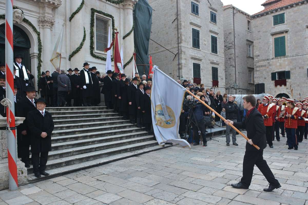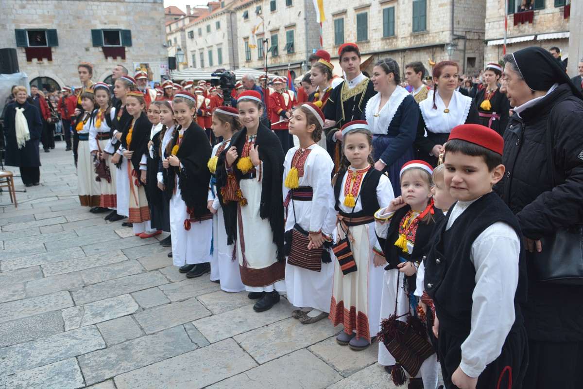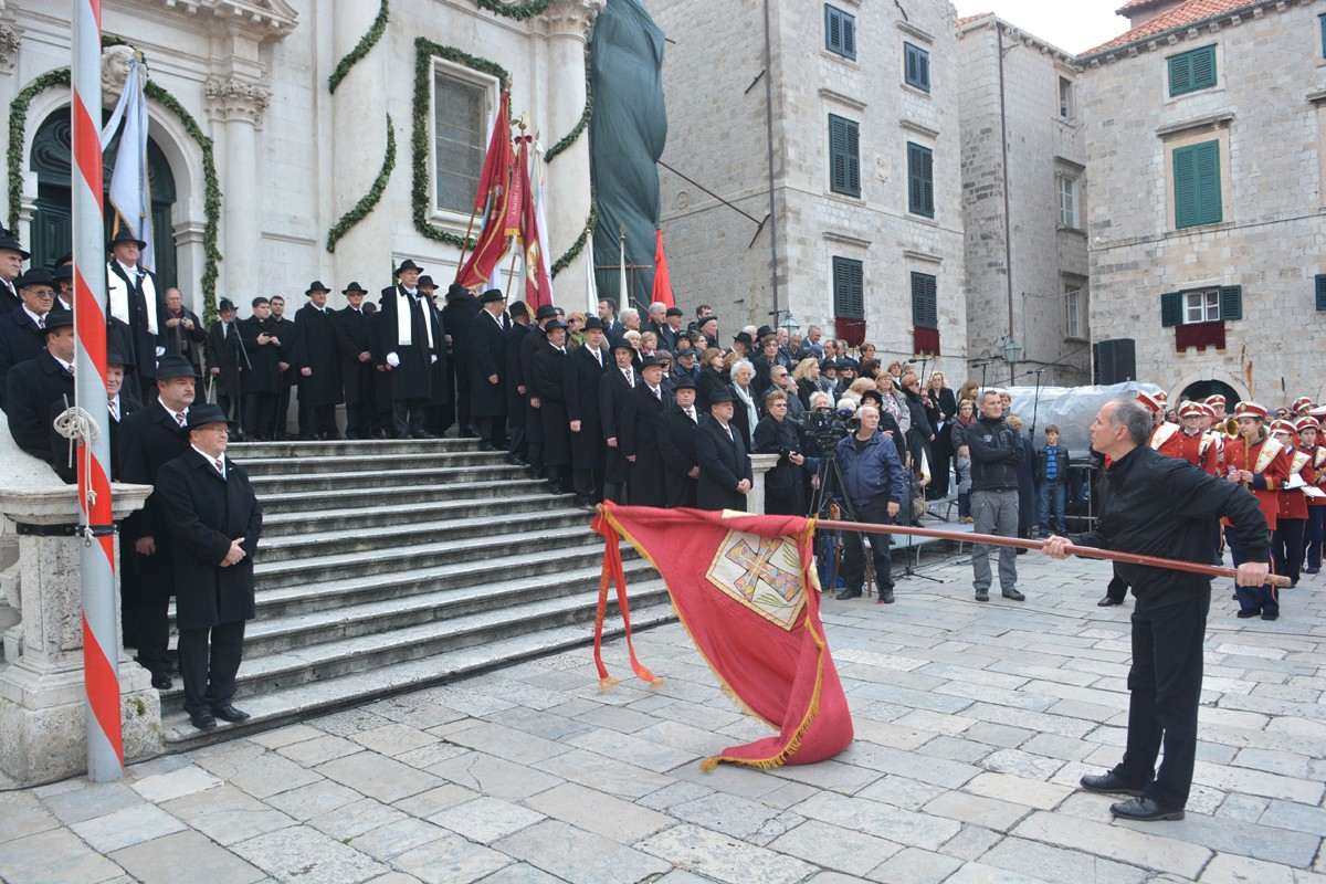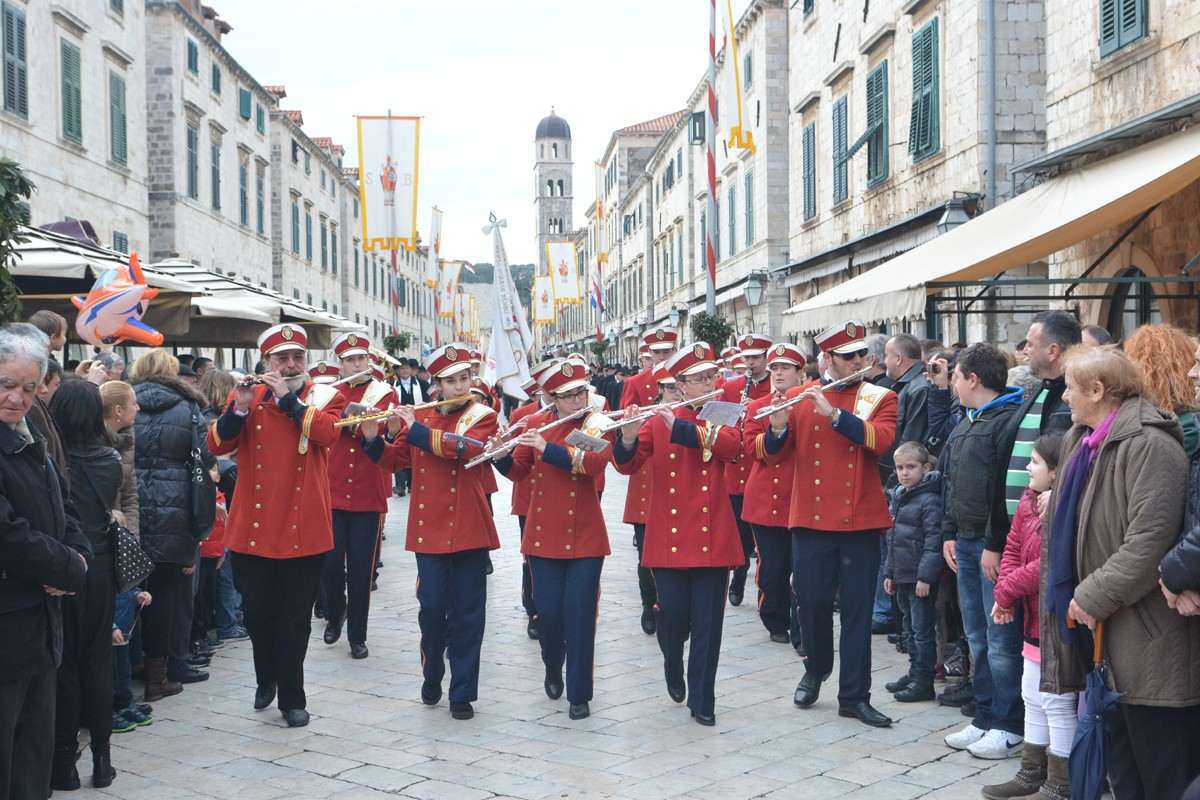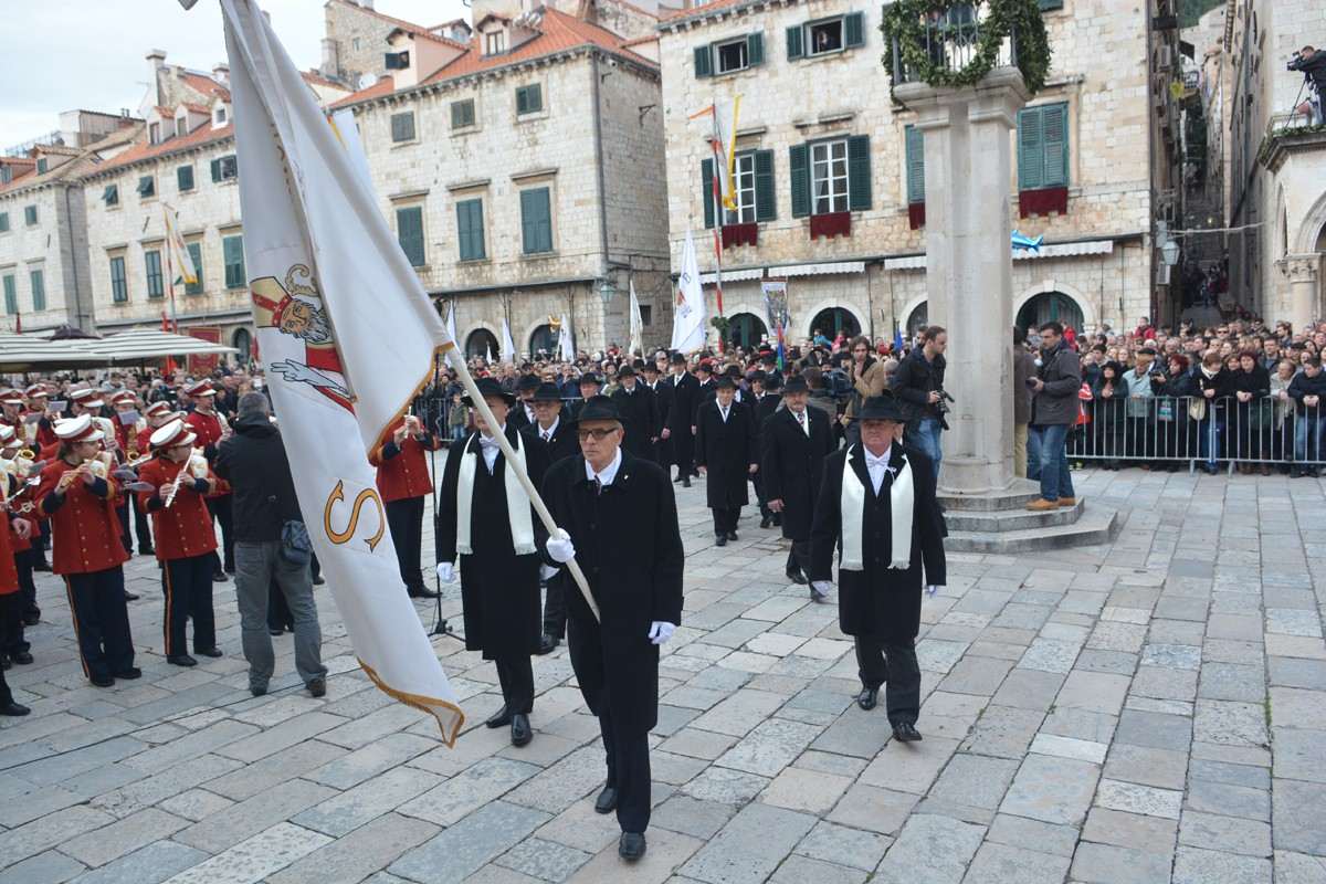 Dubrovnik’s brass band providing the music for the event and Dubrovnik’s Trombunjeri ceremonial gunmen were also in attendance. Masters of ceremony, known as Festanjuli, dressed in traditional sashes and bowler hats, raised the flag of St.Blaise on Orlando’s column, something considered a great honour for those selected. Members of local folklore ensembles were also part of the procession, dressed in their intricate traditional costumes.