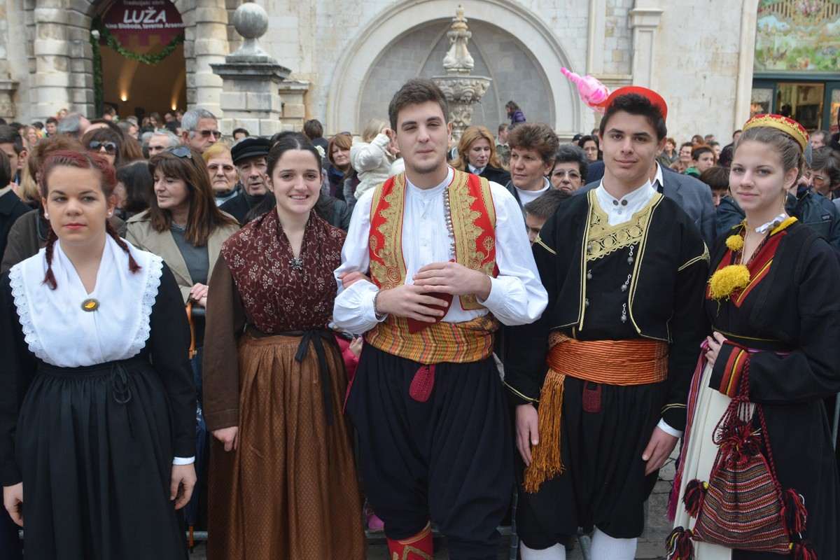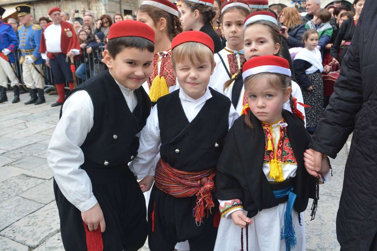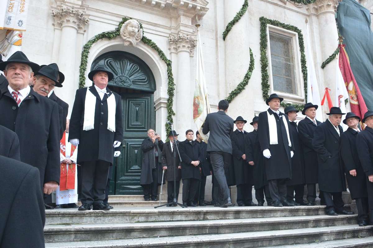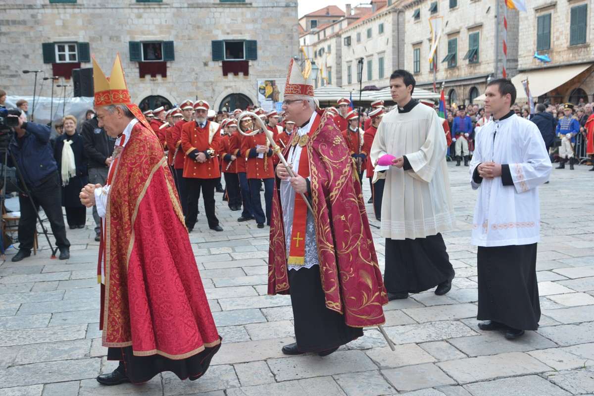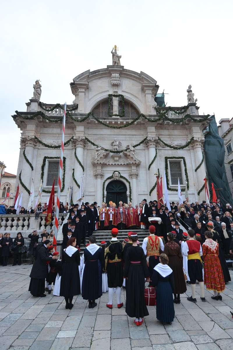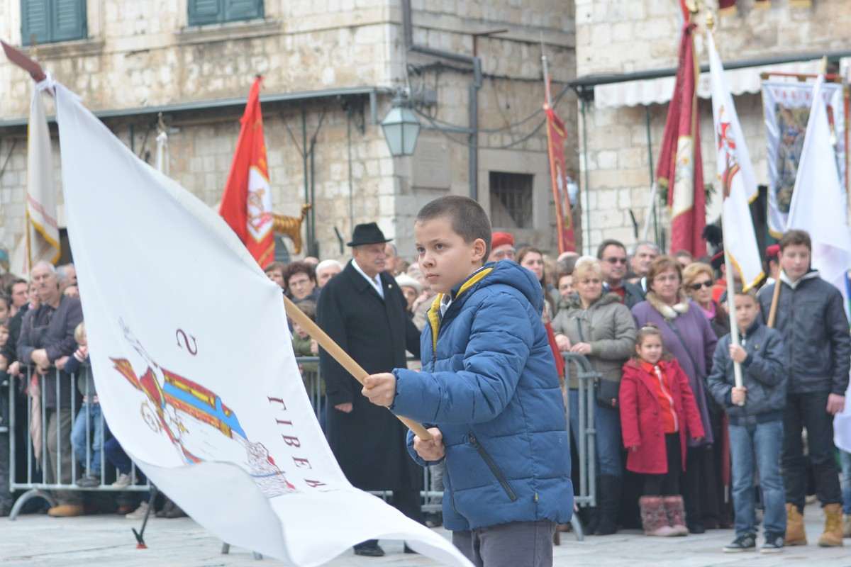 Dubrovnik’s brass band providing the music for the event and Dubrovnik’s Trombunjeri ceremonial gunmen were also in attendance. Masters of ceremony, known as Festanjuli, dressed in traditional sashes and bowler hats, raised the flag of St.Blaise on Orlando’s column, something considered a great honour for those selected. Members of local folklore ensembles were also part of the procession, dressed in their intricate traditional costumes.