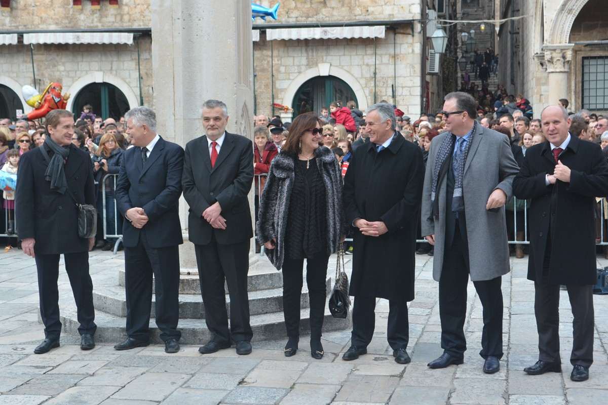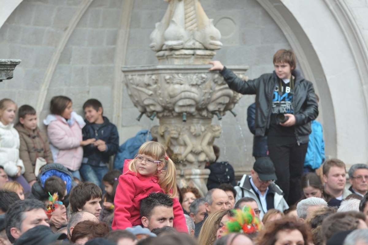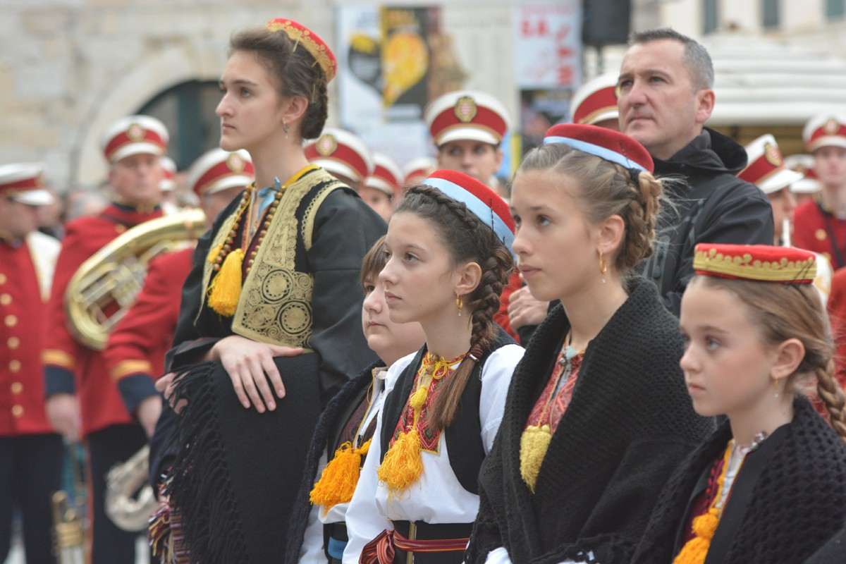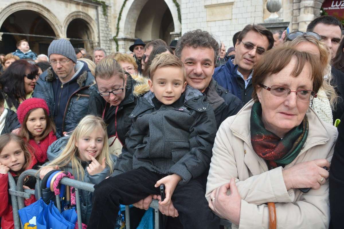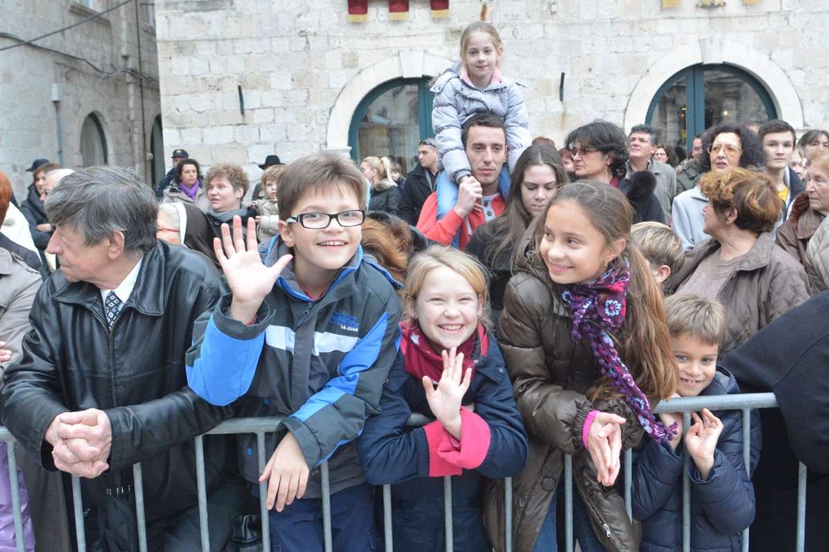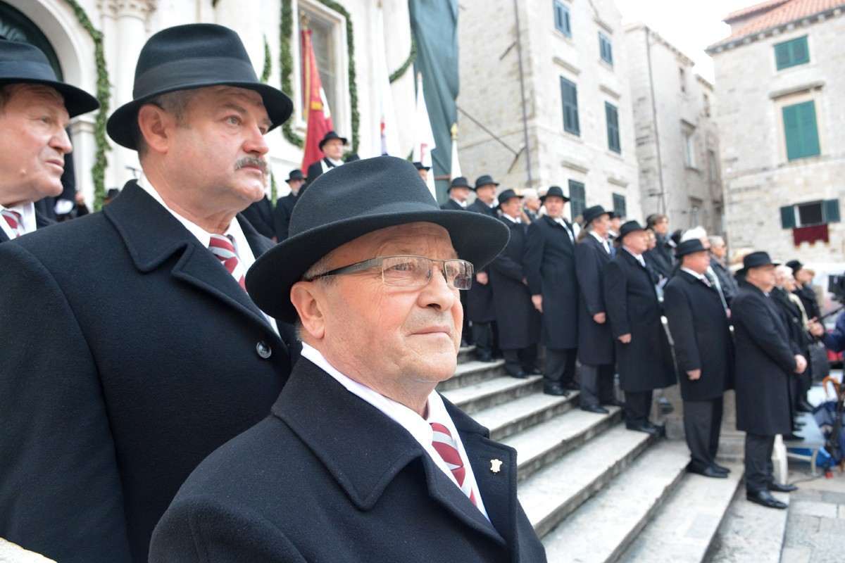 Dubrovnik’s brass band providing the music for the event and Dubrovnik’s Trombunjeri ceremonial gunmen were also in attendance. Masters of ceremony, known as Festanjuli, dressed in traditional sashes and bowler hats, raised the flag of St.Blaise on Orlando’s column, something considered a great honour for those selected. Members of local folklore ensembles were also part of the procession, dressed in their intricate traditional costumes.