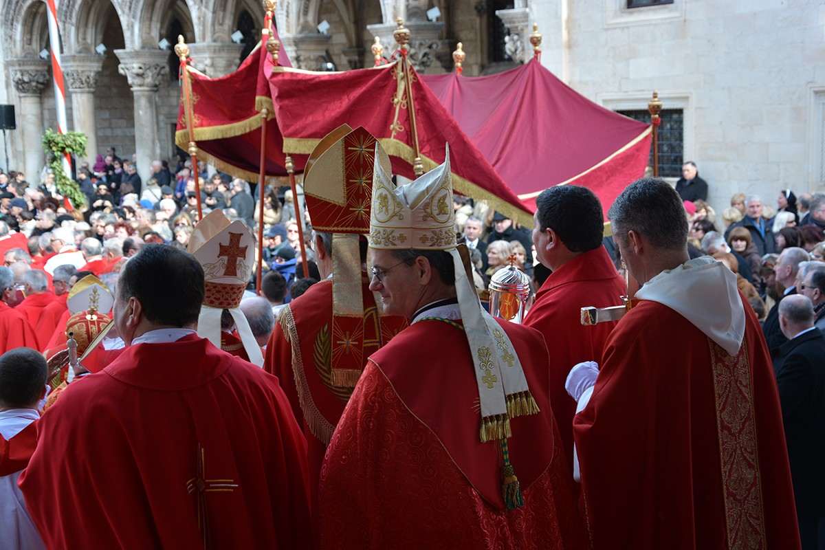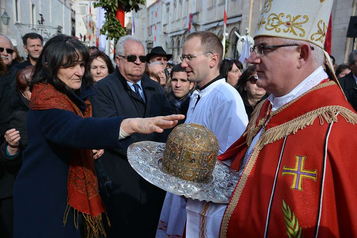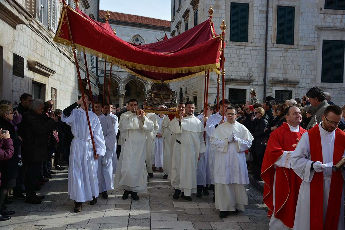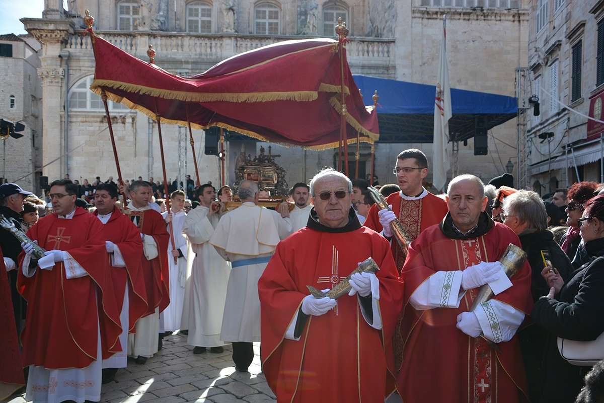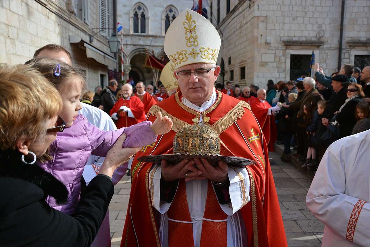 St.Blaise is the city’s patron saint and guardian whose feast day is marked with many celebrations and events in Dubrovnik. Today’s celebration of the feast day of St.Blaise has its roots in ancient legend according to which Saint Blaise , Bishop and martyr of Sebaste , saved Dubrovnik from the Venetians . According to historical records, at the end of the 14th century a Venetian fleet on its way to Levant, anchored in front of the island of Lokrum and Gruz. Locals in Dubrovnik welcomed them with open arms not knowing their true intentions – conquering the city. One night, Saint Blaise appeared to a priest named Stojko of the the then Church of St. Stephen, and warned him that the Venetians wanted to take Dubrovnik. As described by Serafin Razzi, the grey-haired Bishop Blaise, who was accompanied by armed military, said that he was sent from heaven to protect the city from the Venetians, who that night had secretly come to the city walls in order to jump over and begin their attack. According to the vision, Saint Blaise with the help of the heavenly army, threw the Venetians from the walls of Dubrovnik.
