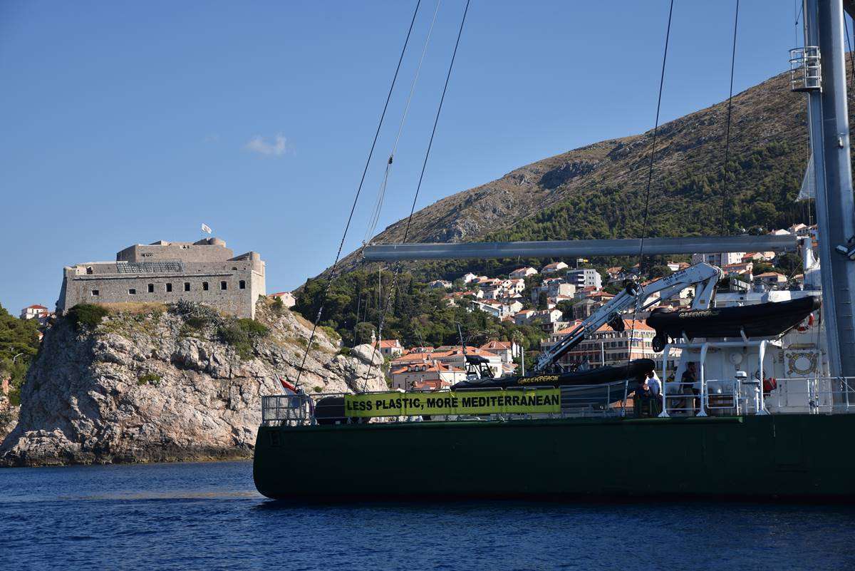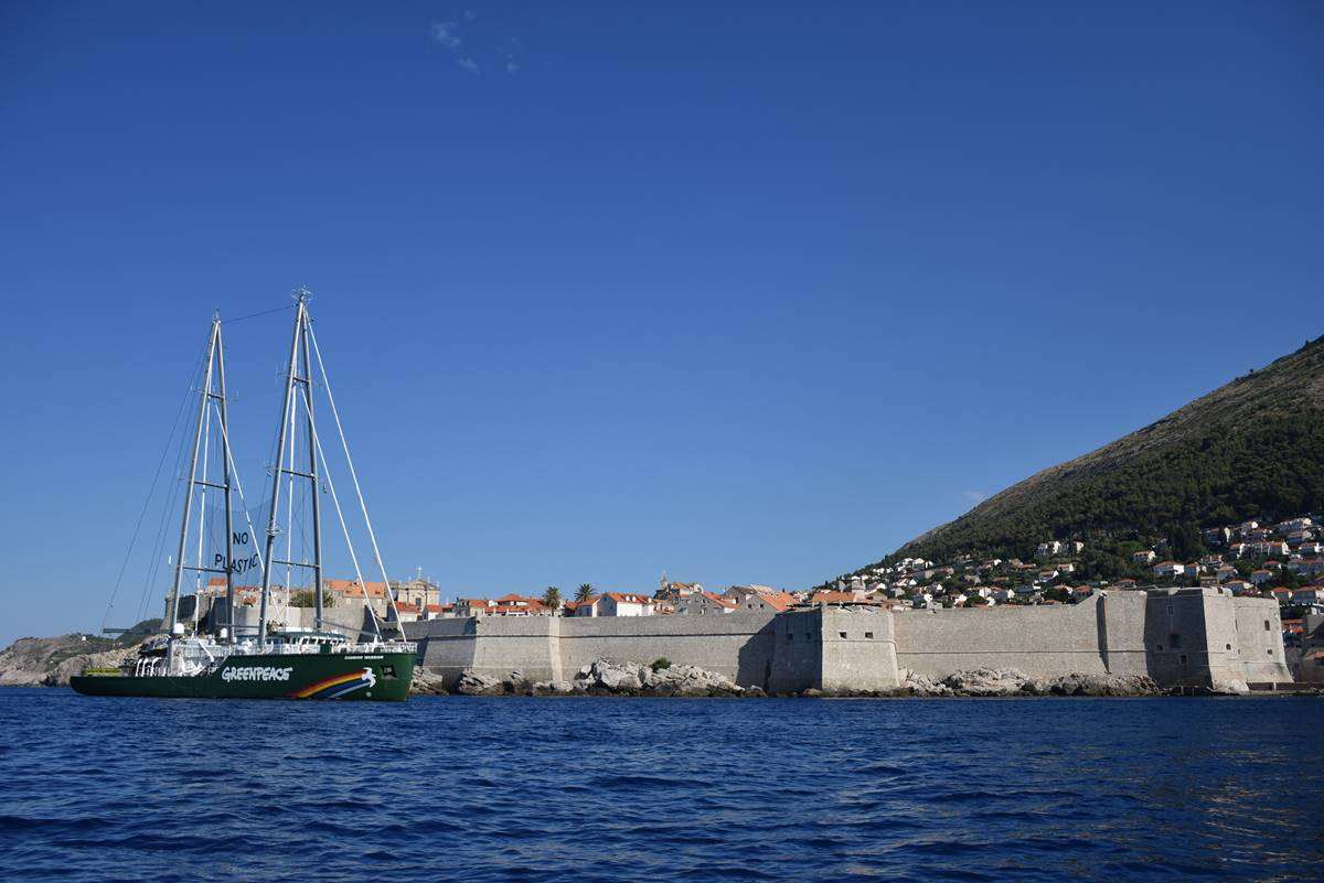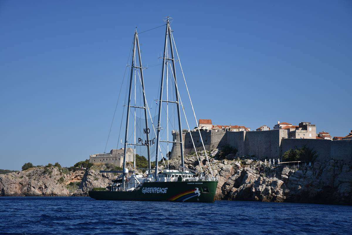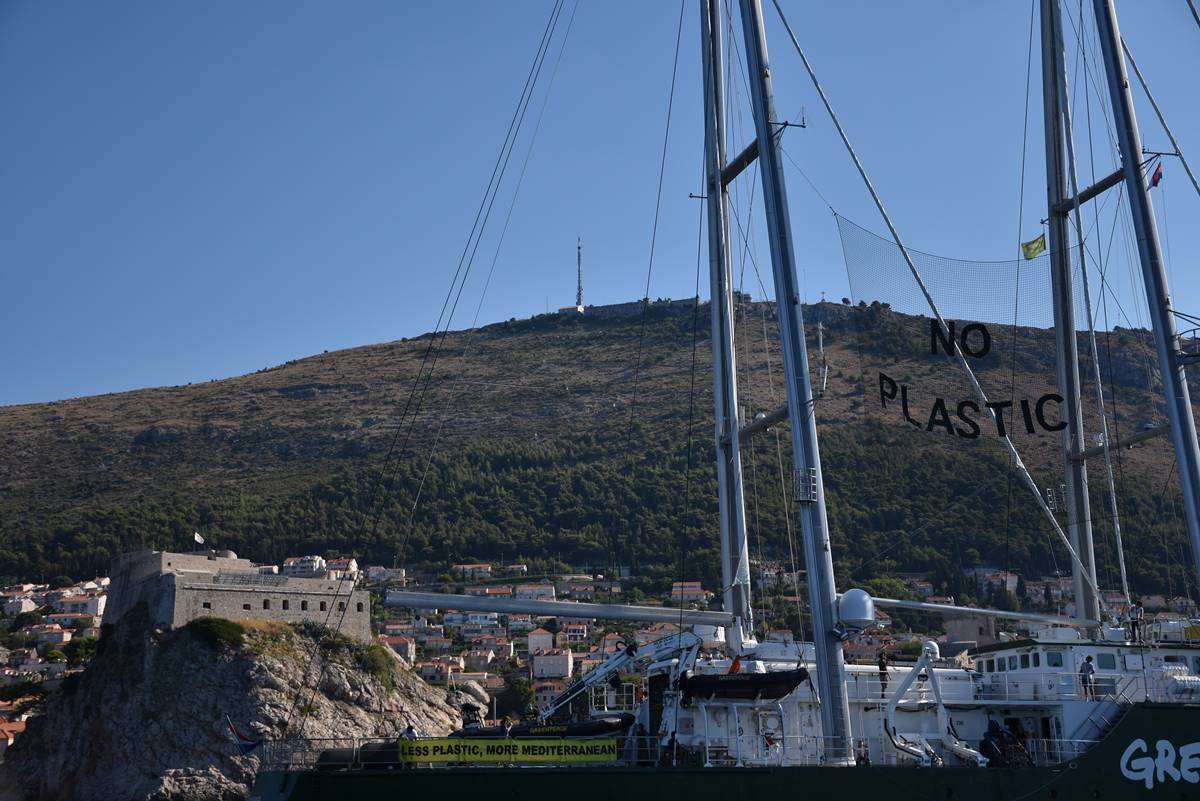 Rainbow Warrior III moored in Dubrovnik this weekend and today they set the straight message ‘Less Plastic, More Mediterranean’ in front o the Old Town of Dubrovnik, pointing out the danger of the pollution of our seas.