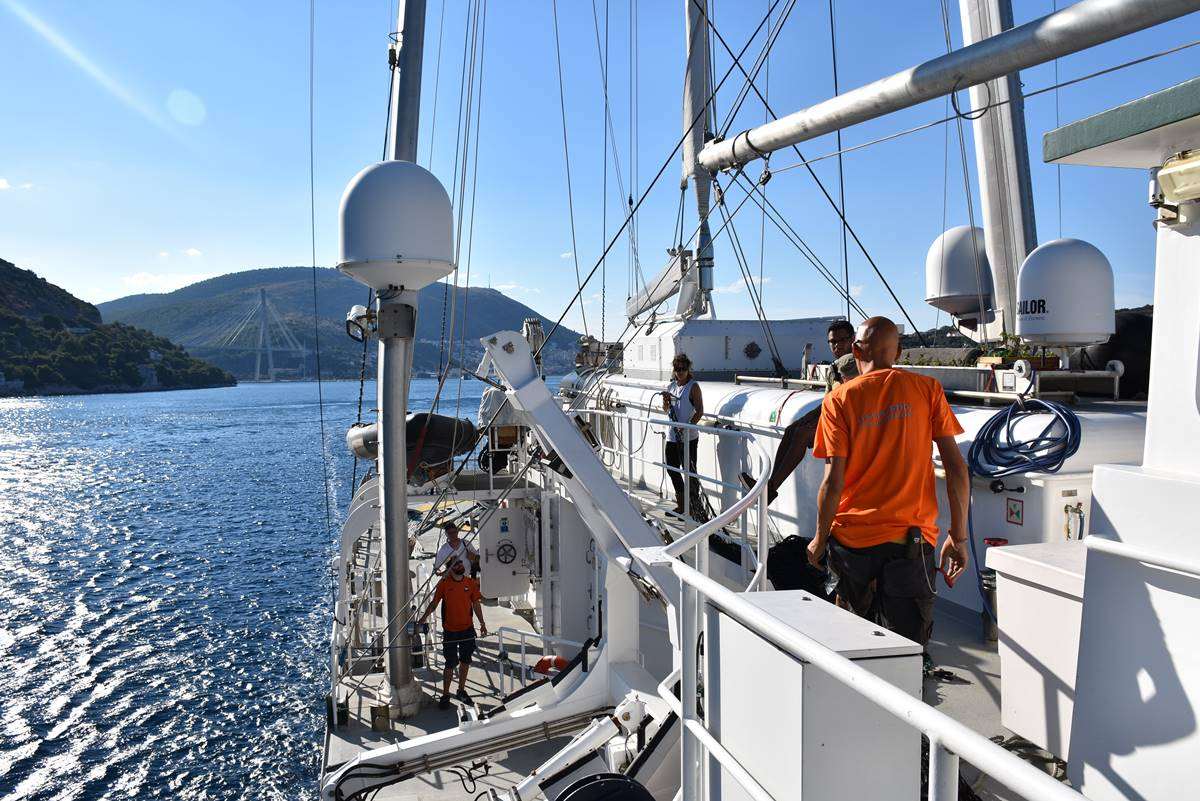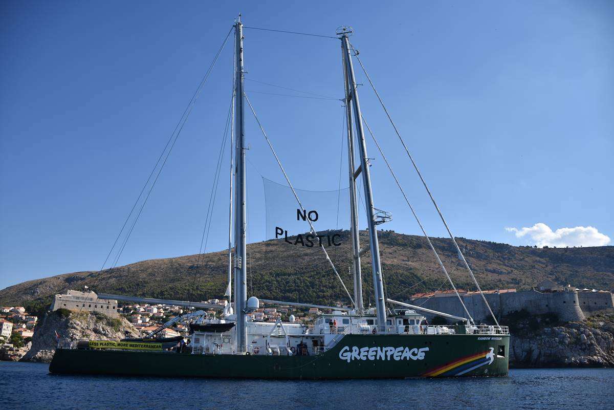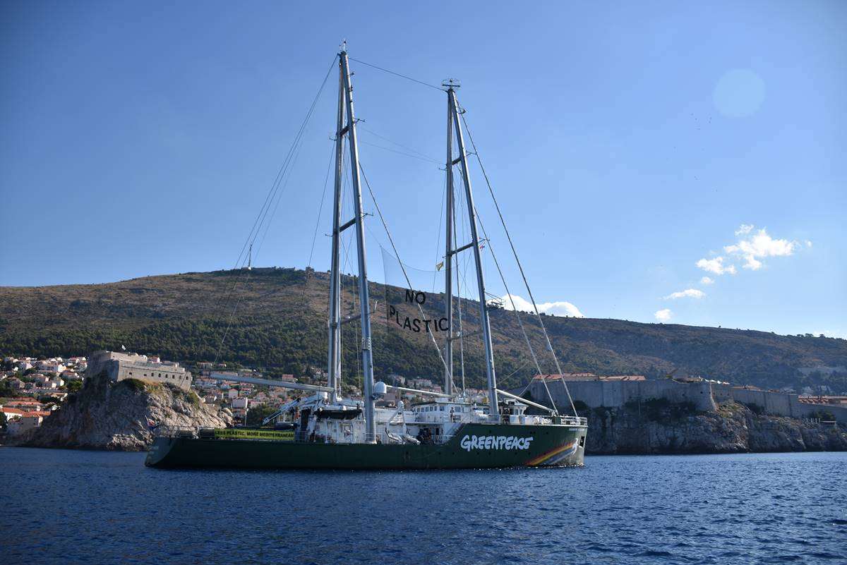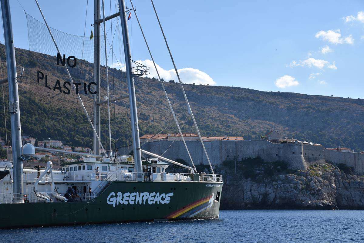 Rainbow Warrior III moored in Dubrovnik this weekend and today they set the straight message ‘Less Plastic, More Mediterranean’ in front o the Old Town of Dubrovnik, pointing out the danger of the pollution of our seas.