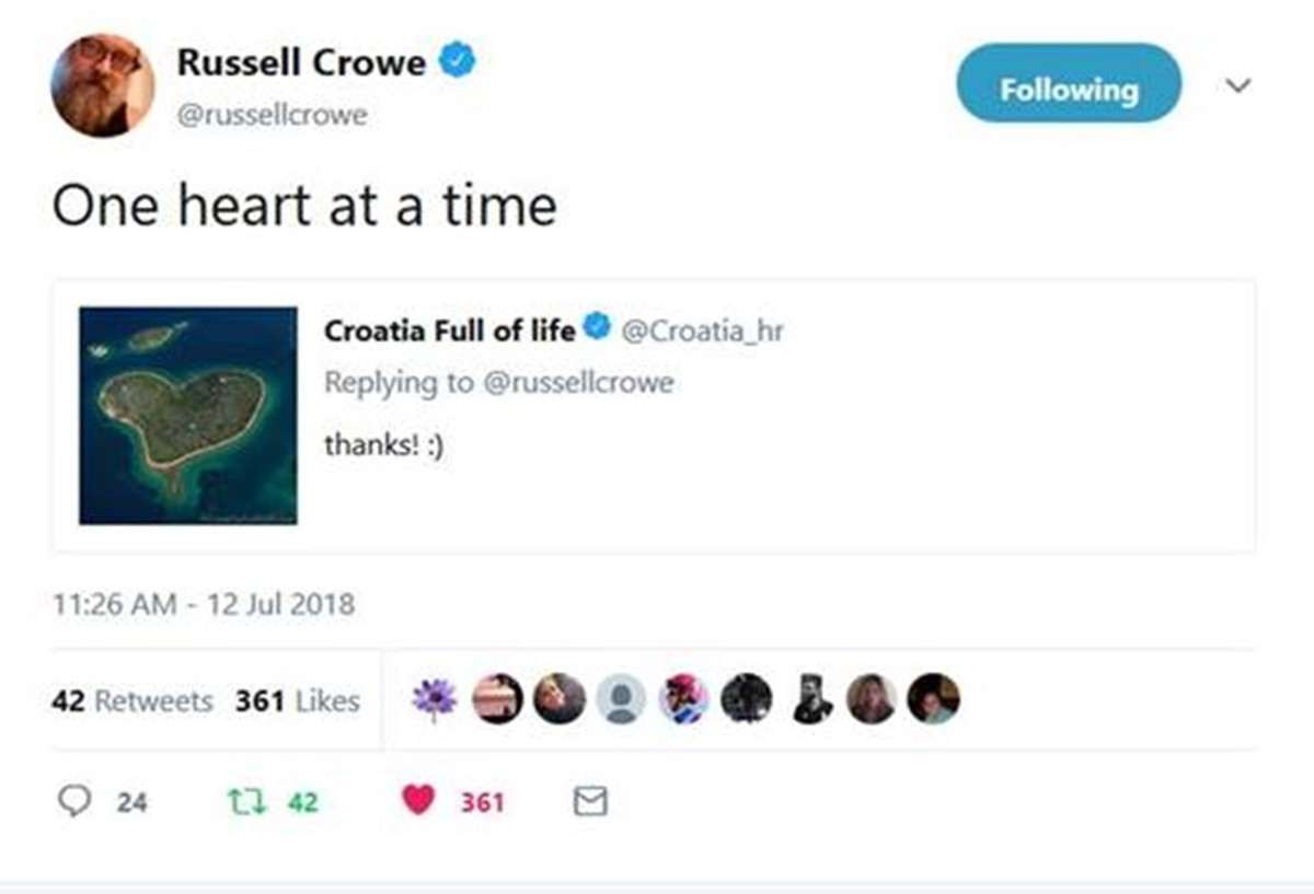 Russell Crowe, famous Hollywood actor, retweeted the post of Croatian Tourist Board, tweeting: ‘One heart at the time’.