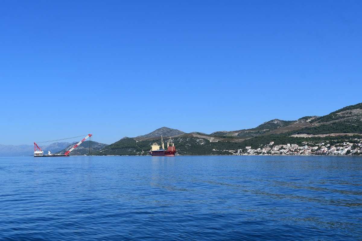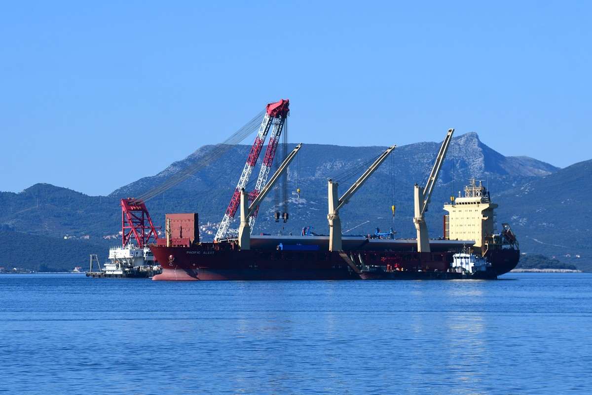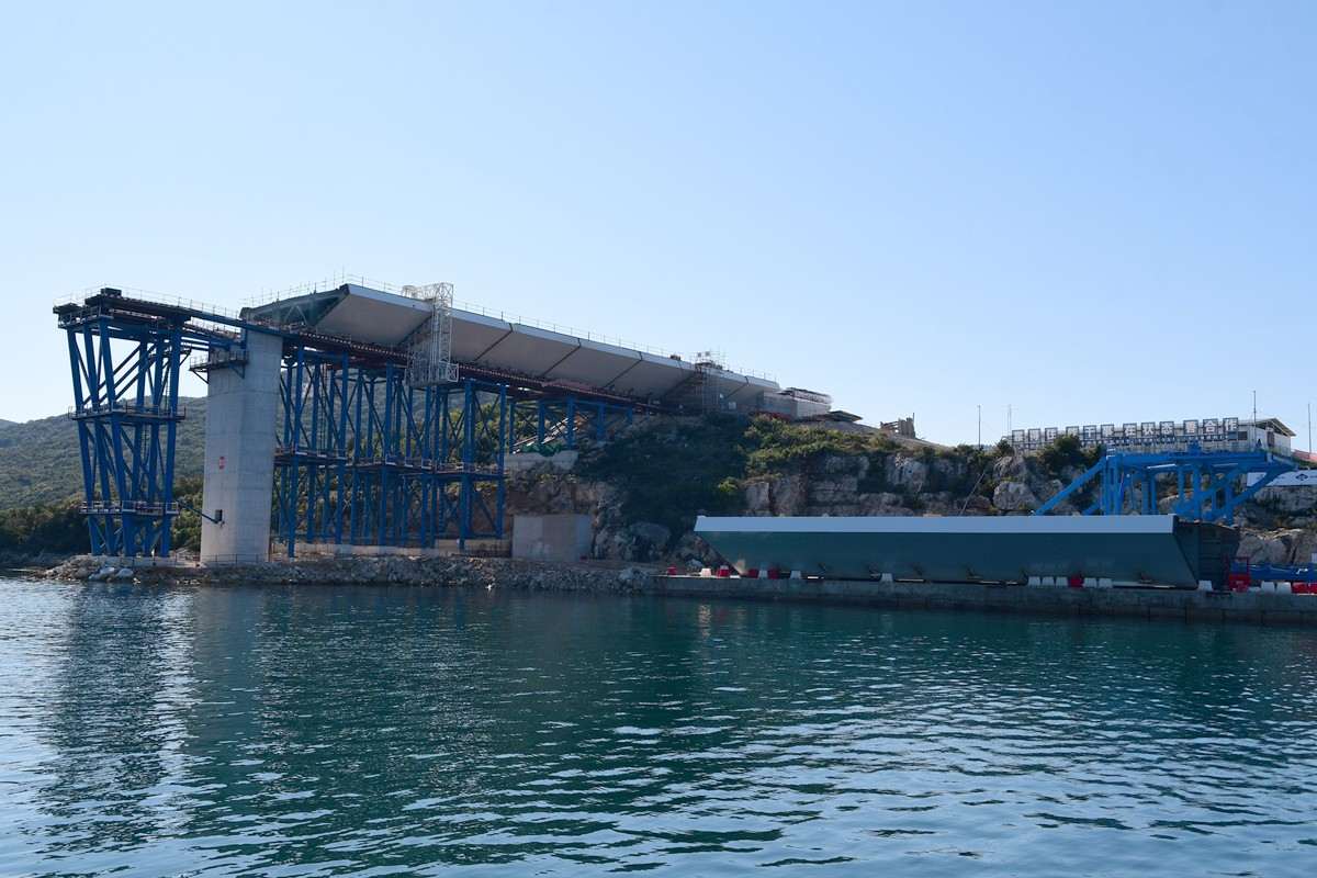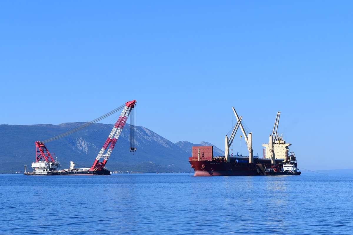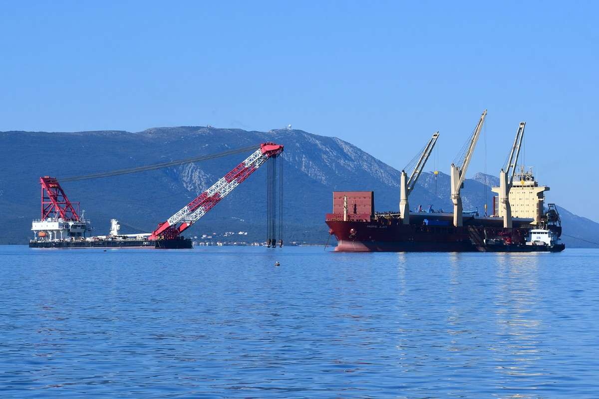 Despite the coronavirus pandemic, constructions on the Pelješac Bridge, the most important infrastructure project in the county, are going full speed. The Pacific Alert ship, which delivered 13 elements of the steel load-bearing structure, sailed into the construction site of the Pelješac Bridge in Komarno this Tuesday.
